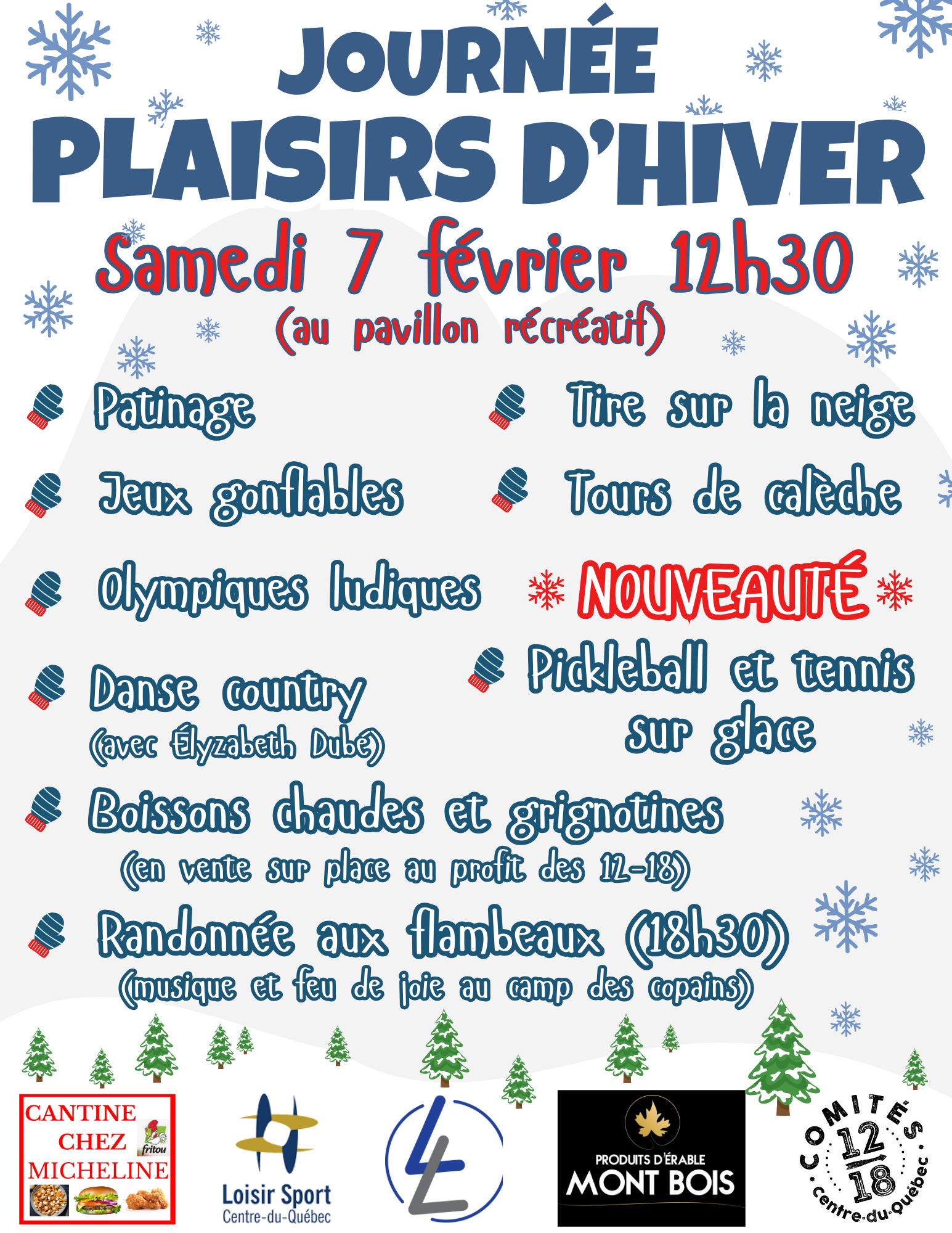 Nous avons une olympiade ludique à partir de 13h30 et vous devez inscrire votre équipe de 5 (minimum 2 filles) auprès de Fred au 819-740-2937 ou au loisirs@laurierville.ca !! Pour la randonnée aux flambeaux, rendez-vous devant l'école à 18h15 pour faire la randonnée en gang !! À partir de 13h00 nous offrirons des tours de calèche dans le village !!